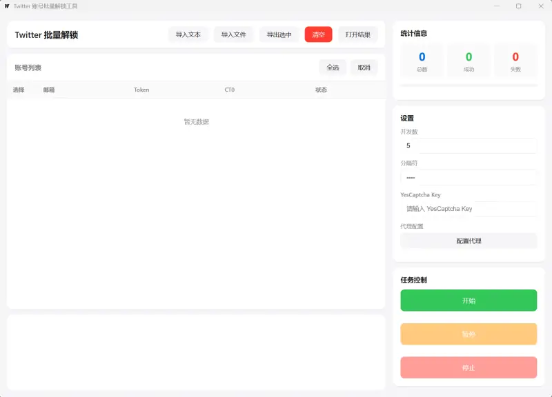本工具是一款专为批量管理 Twitter 账号设计的全自动解锁软件。它支持 TXT 批量导入,提供灵活的线程和分隔符配置。核心优势在于集成了动态代理 IP,有效规避 IP 关联封控风险,并通过打码密钥实现人机验证的自动化处理。解锁结果将自动保存并清晰分类,确保高效、安全地恢复和利用您的账号资源。