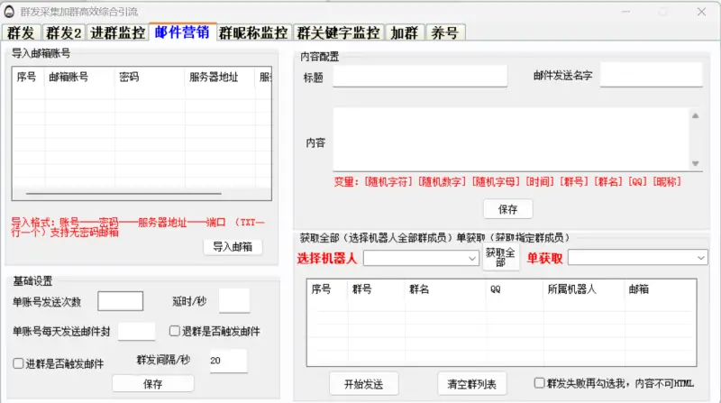 邮件群发: 通过电子邮件批量发送信息,拓展触达渠道,对非QQ活跃用户进行引流或通知。